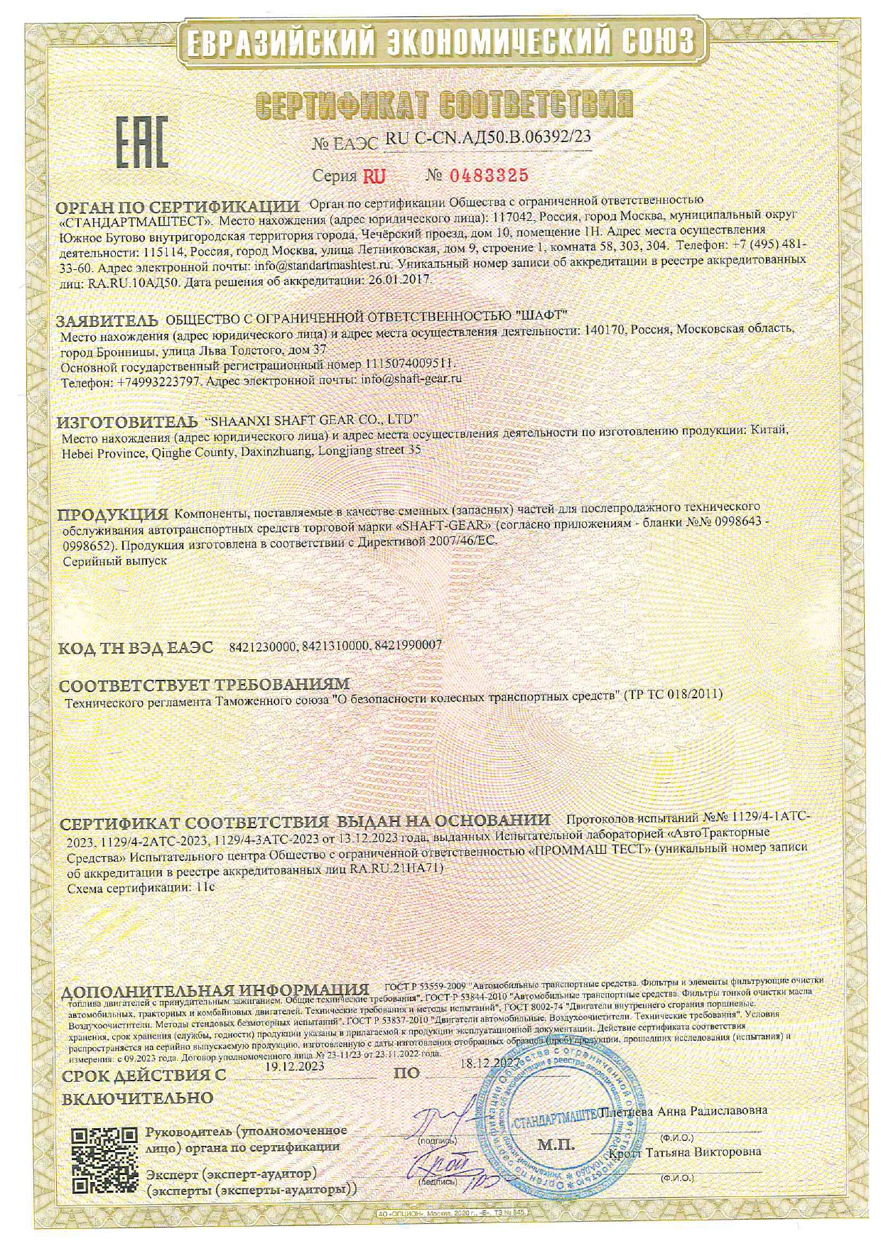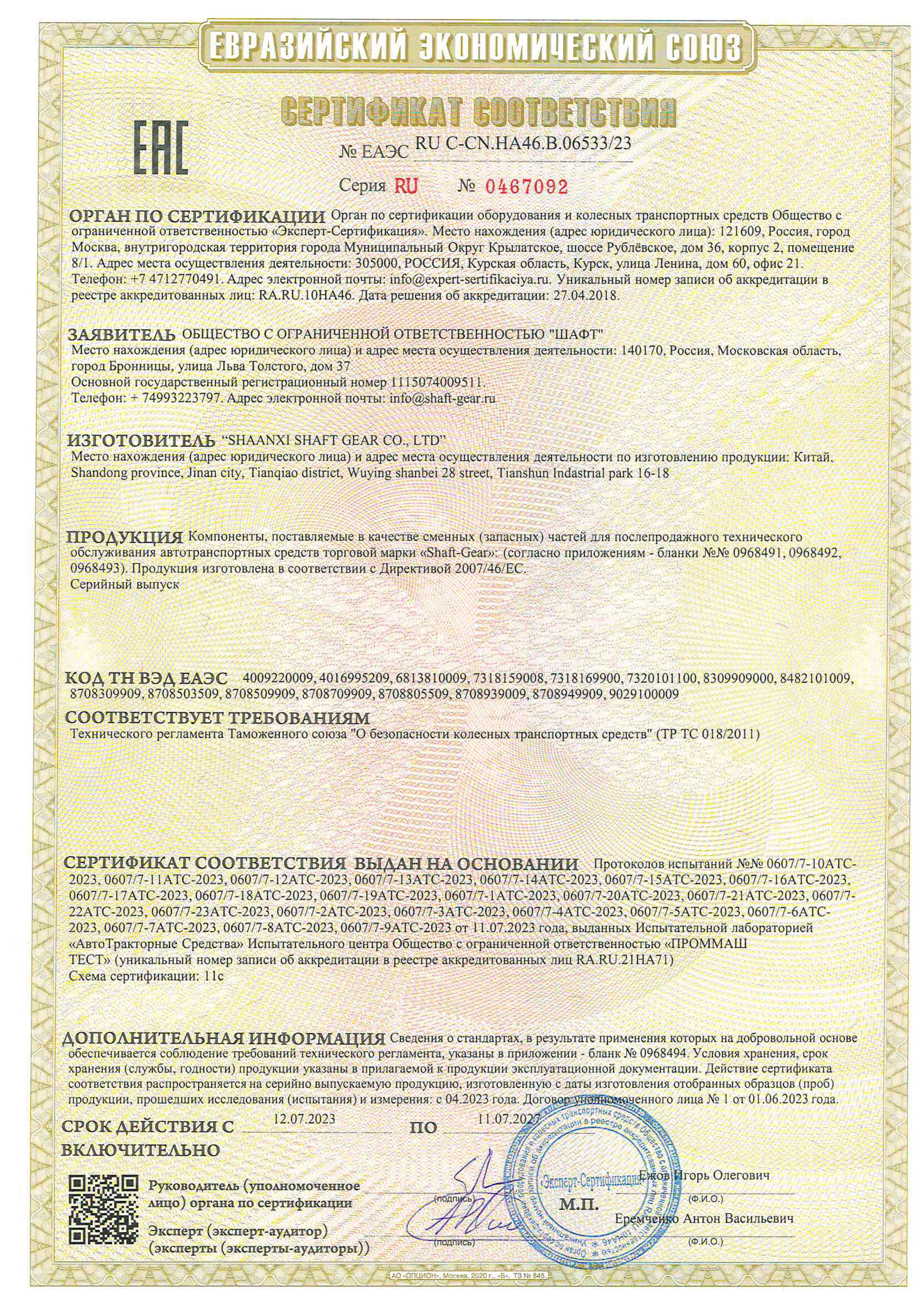 Сертификаты соответствия по запчастям на мосты с июля 2023 г. по июль 2027 г.
