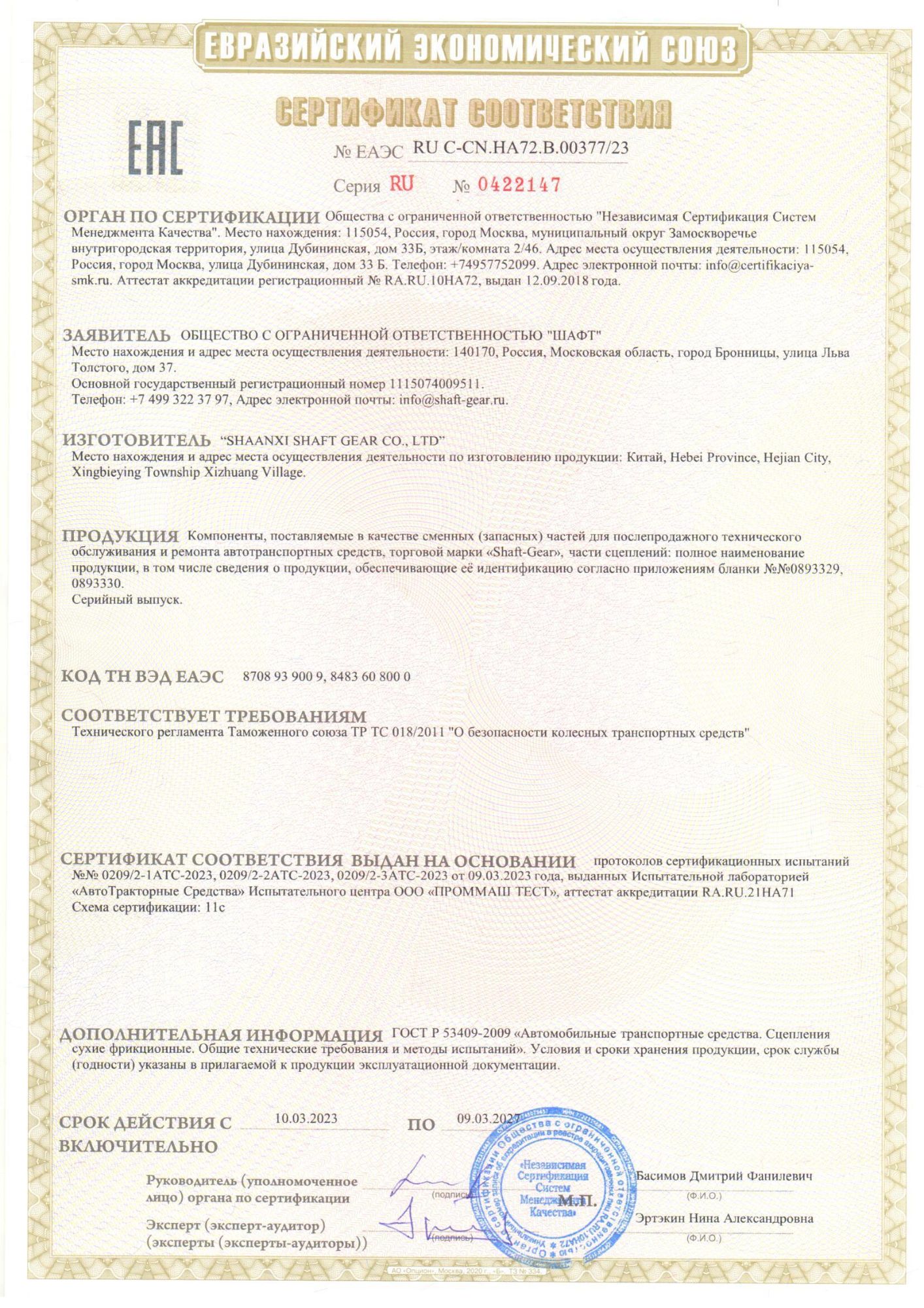 Сертификаты соответствия по сцеплению с марта 2023 г. по март 2027 г.
